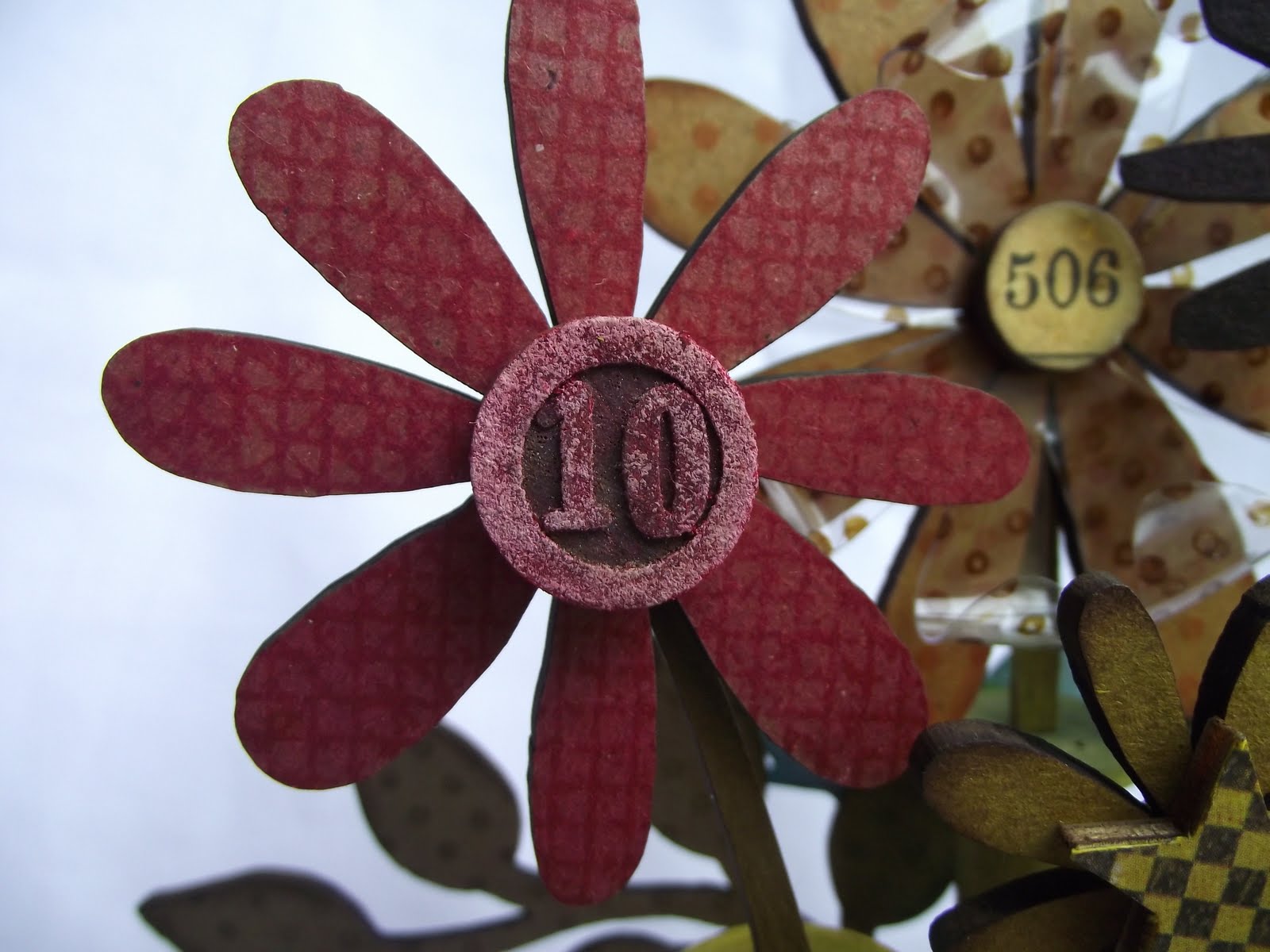 The white daisy (my favourite) is covered in Picket Fence Distress Stain with a little Wild Honey and Mustard Seed Distress Stains in the centre. The stalks and bobbins were coloured with various Distress Stains (Peeled Paint, Crushed Olive and Shabby Shutters)