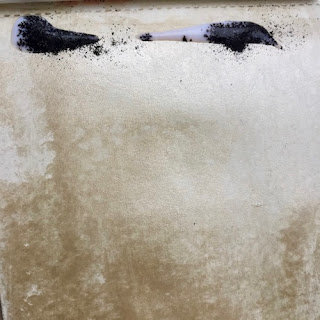 I started by adding White Fire Fresco Paint to my page in my small journal and then a thin line of Matte Glaze at the top. I sprinkled a little Black Knight Infusions over the top. Taking an old credit card I scraped the mixture down the page creating a grungy look.